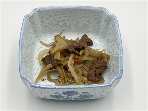 | ④ | さらにゴボウ、こんにゃくを入れて油を馴染ませたら、材料がひたひたになるくらい水を入れる。煮立ったら、砂糖、醤油を入れて味をつけ、鍋に蓋をして汁けがなくなるまで煮て完成 |