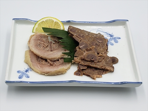 皮身鯨肉を薄く切ってゆがいたもので、昔は塩蔵の皮身鯨肉が保存が利くため、生魚が獲がたい夏などに酒の肴として重宝されました。現在もお祝いの席によく出ます。