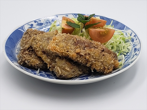 竜田揚げと違い、塩、コショウで下味をつけた赤身鯨肉にパン粉をつけて揚げたもので、鯨肉の味と食感をストレートに味わえます。