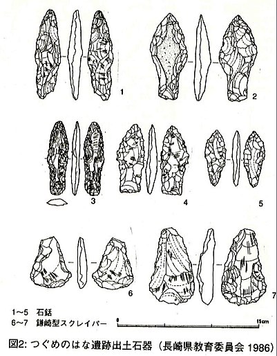 昭和46年(1971)から行われた発掘調査で、縄文早〜中期中葉にあたる土器や石器などが出土しましたが、とりわけ石銛やスクレーパー(掻器)という石器が大量に出土しました。石銛とはサヌカイト(安山岩)という石で作られ、全長は大きなもので10センチ程で、先が尖り両側に広がりを持ち、根本が狭まった形の石器です。この石器は、西海各地の沿海部の遺跡からも出土していますが、どこも数点程度に止まっています。しかしつぐめのはな遺跡からだけは、数百点単位で出土しています。先が尖ったこの石器は、木の柄の先に付け、大きな獲物を突く用途で用いられたと思われます。