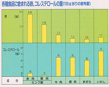 | 【鉄の良い供給源】 ミンク鯨肉100g中には、鉄が赤肉で8.5mg、尾肉で5.6mgと食肉中では、馬肉と同じく著しく多い。 しかも、鉄の形態が最も吸収されやすいミオグロビン鉄と呼ばれる有機体の形となっており、このことからも、鯨肉は鉄の大変良い供給源となっています。 |