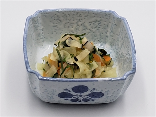 | ④ | ボウルに大根、ニンジン、セリを入れて混ぜ合わせた上でしぼる。その後皮身鯨肉を加え、味噌、砂糖、酢、料理酒を入れて和える。 |