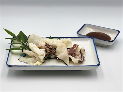 | ⑥ | ③の赤身鯨肉に、④の衣をつけ、⑤の鍋に4~5枚入れてカラッと揚げる。揚げ過ぎると固くなるので注意する。 |