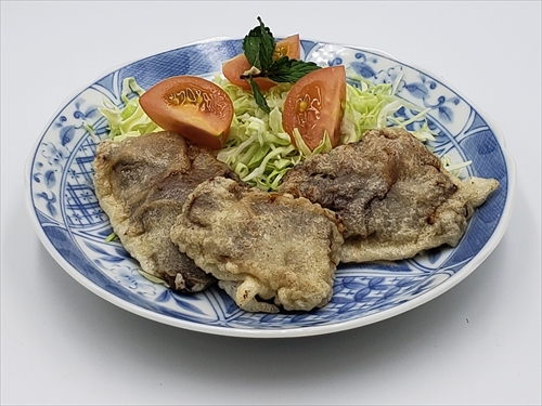 | ① | 赤身鯨肉を4cm×5cm、厚さ8mm程度に切って、塩、コショウを振る。 |